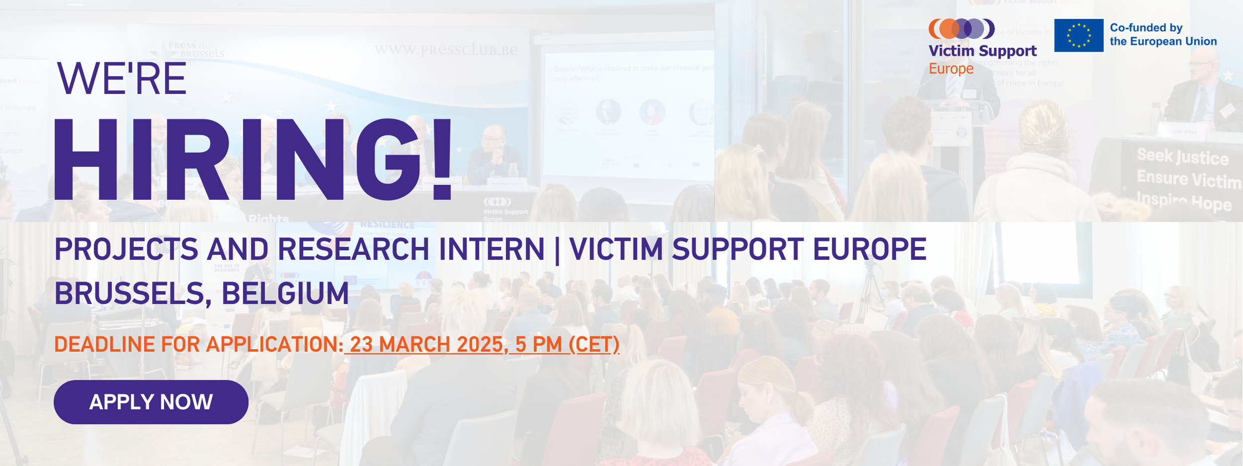 Send your CV and motivation letter (1 page max) by email at recruitment@victimsupporteurope.eu noting “Project & Research Internship 2025 – YOUR NAME” in the subject line, by 22 October, 23:59 CET.